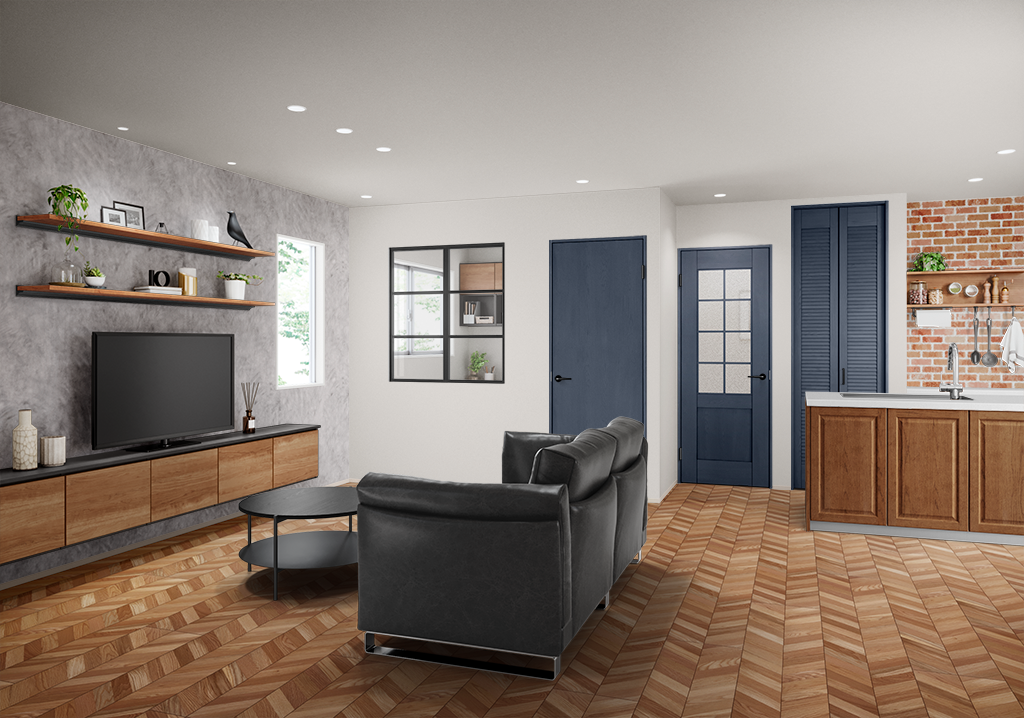 懐かしさと無骨さが魅力。ブラウンやネイビーをベースに、アイアンや古木を組み合わせると雰囲気が出ます。パーケットフローリングやブロンズ金物で個性をプラス。