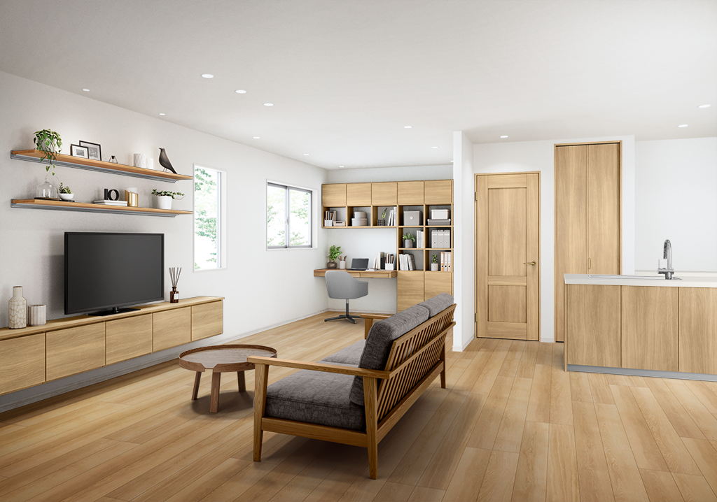 木目の温もりを活かす明るい空間。ナチュラルオーク+ホワイト/ベージュでまとめると、どんな家具とも調和しやすい万能スタイル。