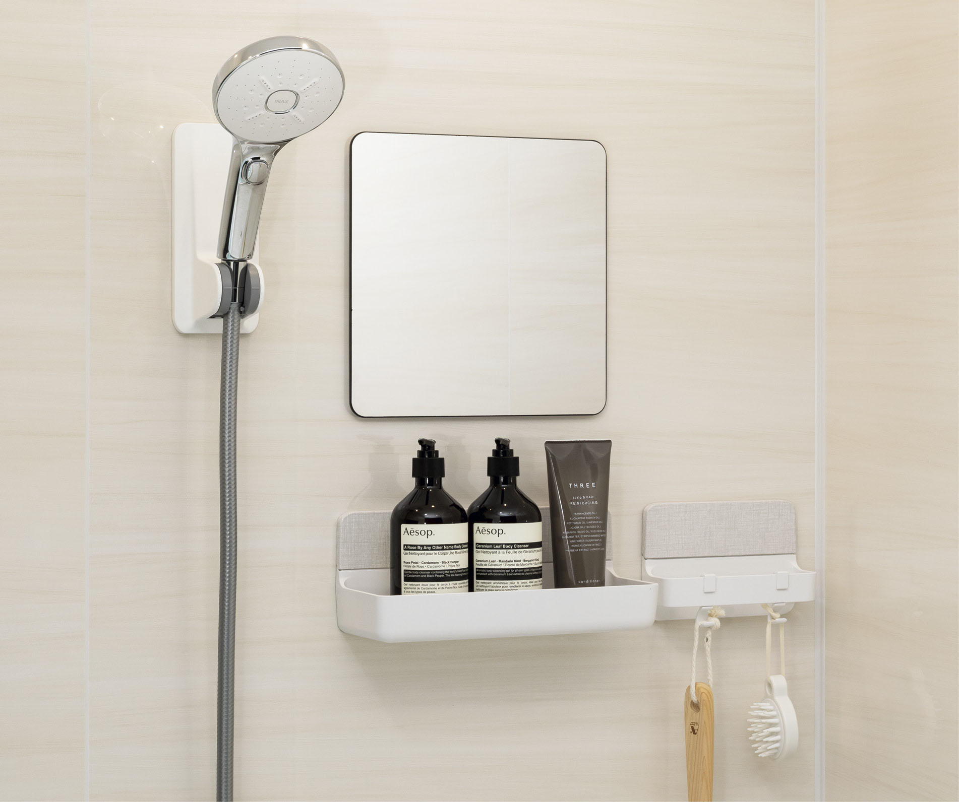 キッチンパネルや浴室パネルをマグネット対応にすると、棚・フックを自由配置。